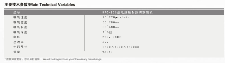 適用于PE、PP、OPP、BOPP、OPF等塑料材料自動熱切制作的針織、服裝、食品、文具等包裝,是目前替代進(jìn)口同類產(chǎn)品的先進(jìn)制袋設(shè)備。